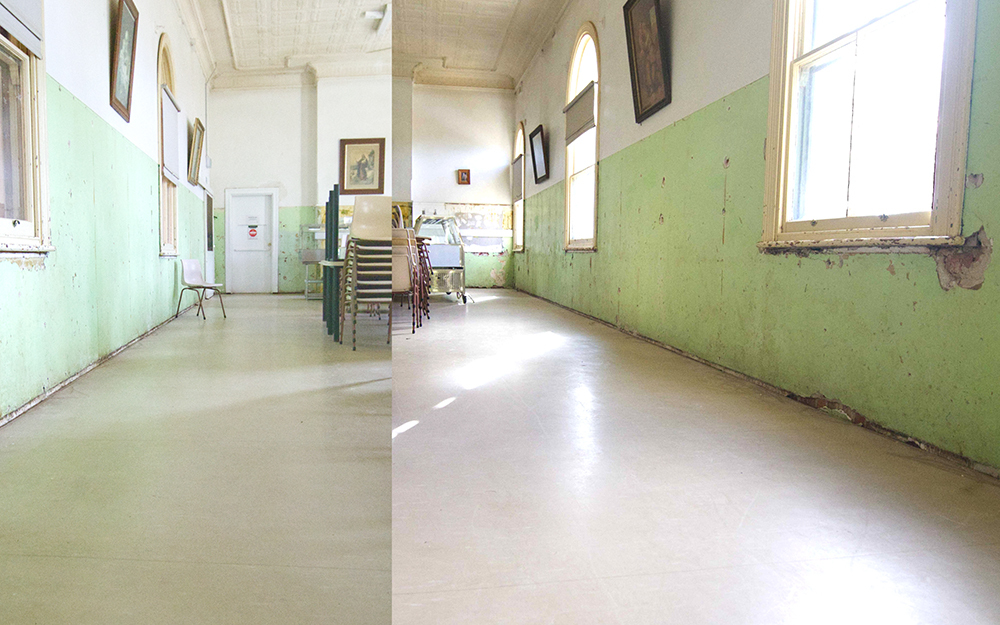 The latest work saw Ian and Greg from our Maintenance team stripping three layers of lino, tiles and Masonite to expose the original floors. Fiddly work, removing thousands of 15mm staples that held the Masonite in place!
