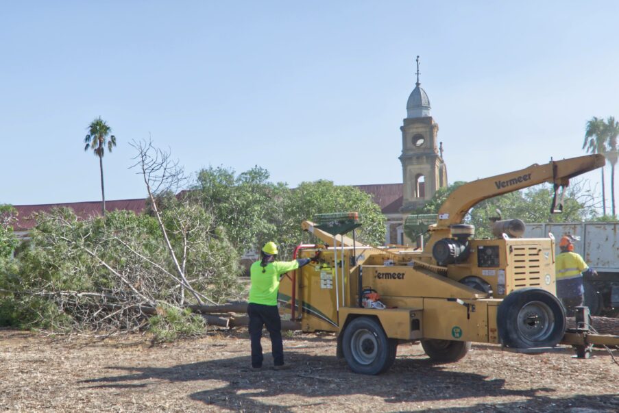 The felled trees were disposed of by mulching, which was spread across open ground.