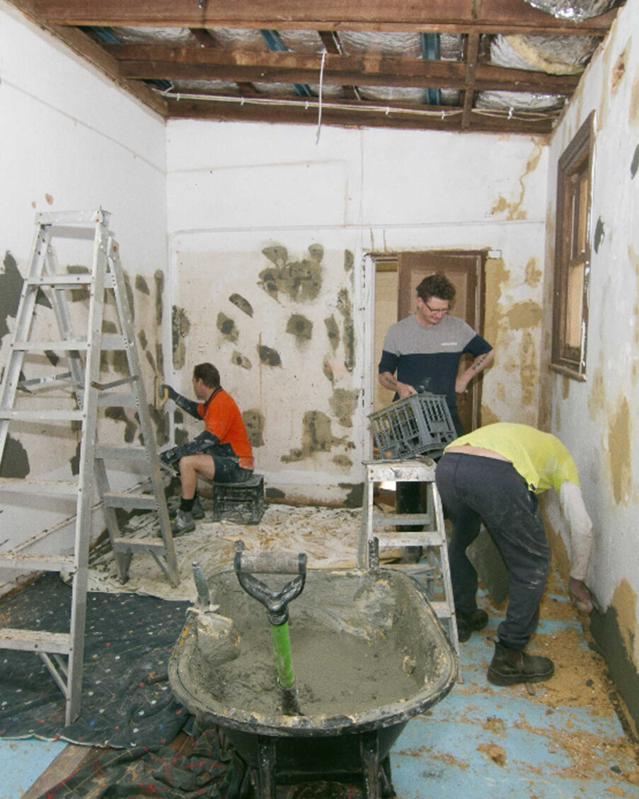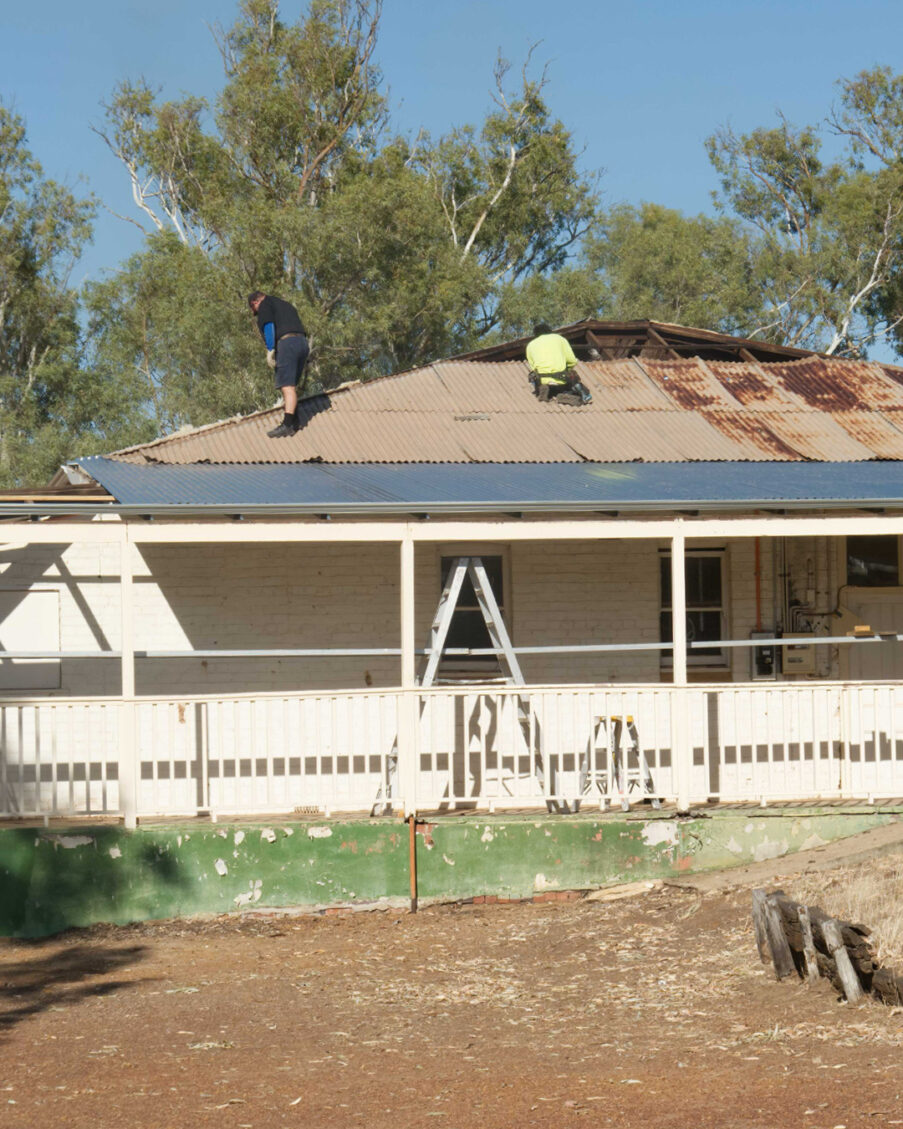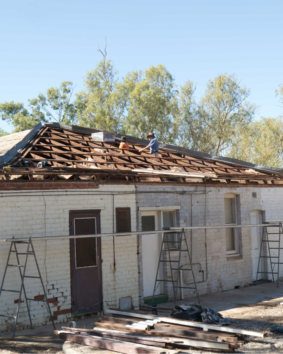 These projects start from the top and work down. First the south verandah was removed and once Top Gun Roofing had started taking off the tin, Shady and Ian could get into the rafters, remove elements and replace what needed replacing. Then the Top Gun Roofing crew got to work and replaced the roof. The old chimney needed some work, and meanwhile the inside of the building was cleared of all the things that had been stored in there over the years.