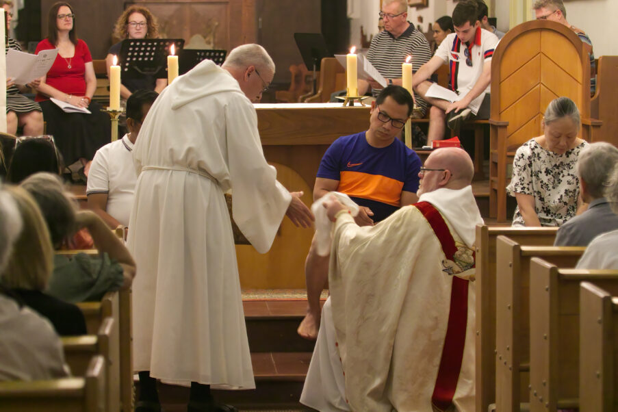 Holy Thursday highlights the servant nature of Jesus and follows the Gospel of St John in the foot washing in the upper room, followed by the liturgy of the Eucharist then the transfer of the Blessed Sacrament to the altar of repose in the Spanish chapel in the monastery and a vigil until midnight: Stay with me, remain here with me: Watch and pray.