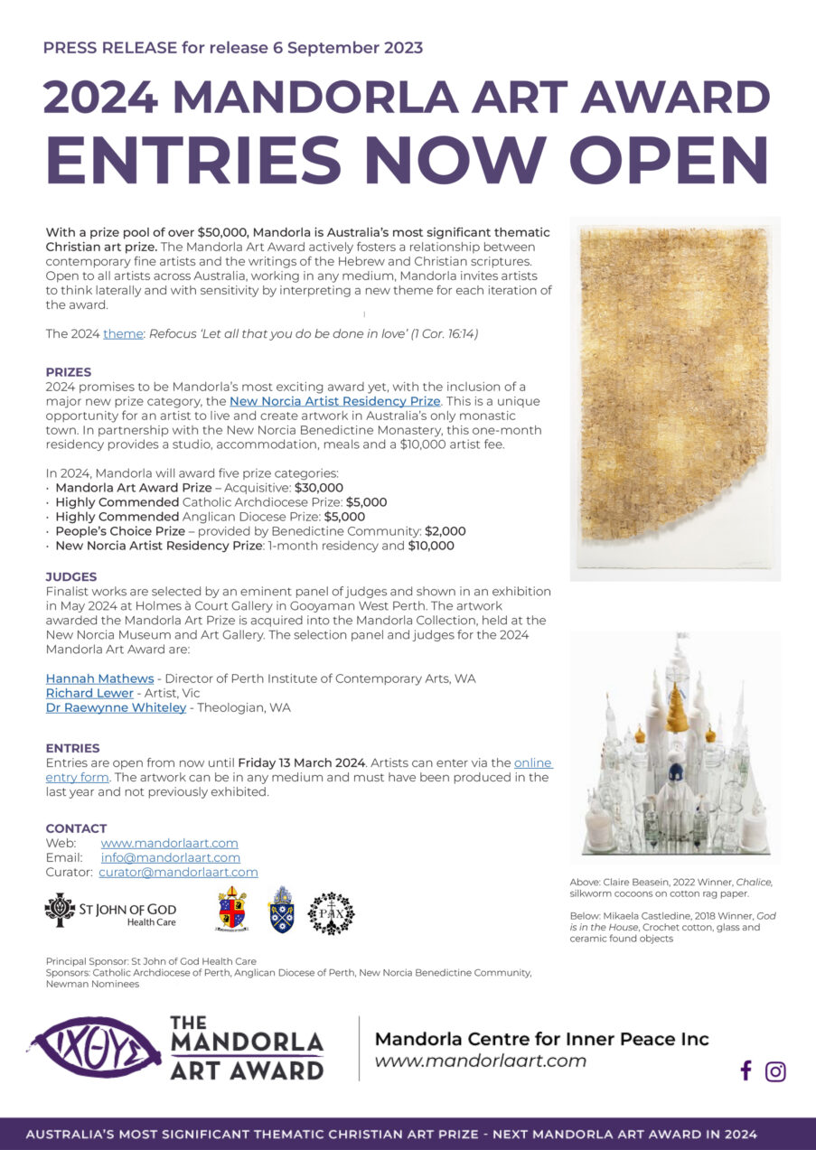 With a prize pool of over $50,000, Mandorla is Australia's most significant thematic Christian art prize. The Mandorla Art Award actively fosters a relationship between contemporary fine artists and the writings of the Hebrew and Christian scriptures. Open to all artists across Australia, working in any medium, Mandorla invites artists to think laterally and with sensitivity by interpreting anew theme for each iteration of the award.