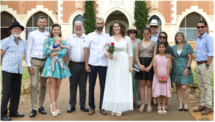 After the photographs were taken, we all moved to the Hostel for much needed drinks and a festive wedding meal, generously hosted by the Abbot representing the Benedictine community. New Norcia parishioners and visitors were treated to a slice of wedding cake – the happy couple having left for their honeymoon in Augusta.