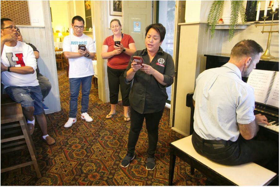 We then welcomed new members to “Team New Norcia”: Shelly (Roadhouse), and French backpackers, Iness (Roadhouse) and Julian (Grounds and Maintenance). And what would a community celebration be without a song.