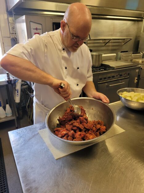 Abbot John making a Traditional Persian curry. As part of the food safety supervisor training, he was supervised by central catering manager Marlon Victoriano.